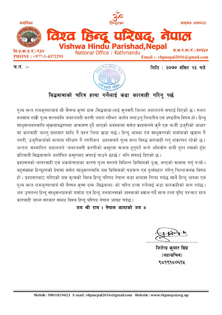 साथै अब हिन्दू साधुसन्तहरुको मर्यादा एवं हिन्दू जनमानसको आस्थाको ख्याल गर्दै सत्य तथ्य पुष्टि पश्चात मात्र कारवाही थाल्न सरकार समक्ष विश्व हिन्दू परिषद नेपाल आग्रह गरेको छ।