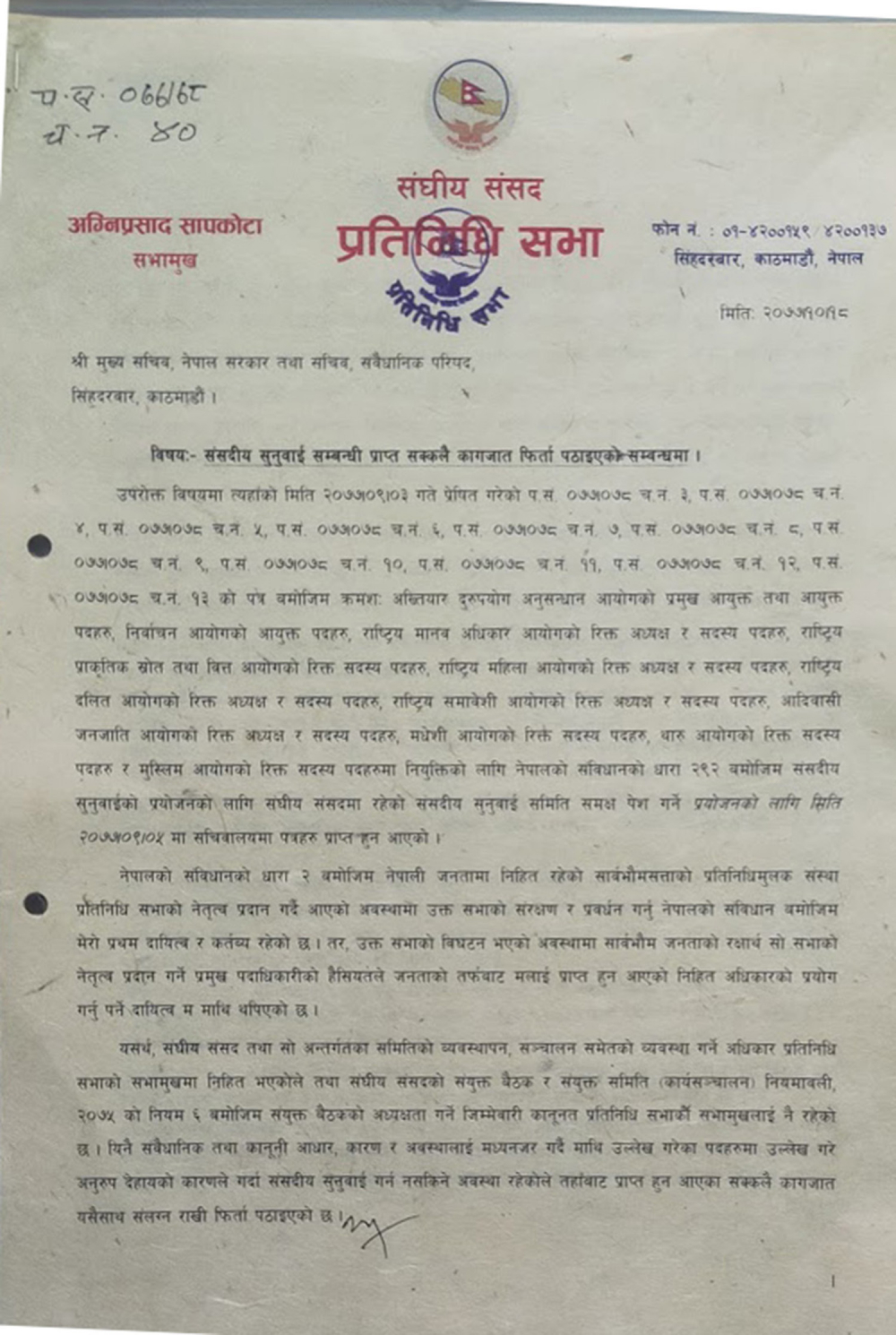 सभामुख सापकोटाले विभिन्न कारण देखाउँदै संसदीय सुनुवाइ हुन नसक्ने भन्दै संसदीय सुनुवाइ सम्बन्धि कागजात फिर्ता गर्नुको कारणहरू उल्लेख गरेका छन् । पुस ५ गते संसद् सचिवालयमा संवैधानिक परिषद्ले विभिन्न संवैधानिक आयोगहरूमा नियुक्तिका लागि सिफारिस गरेको थियो ।