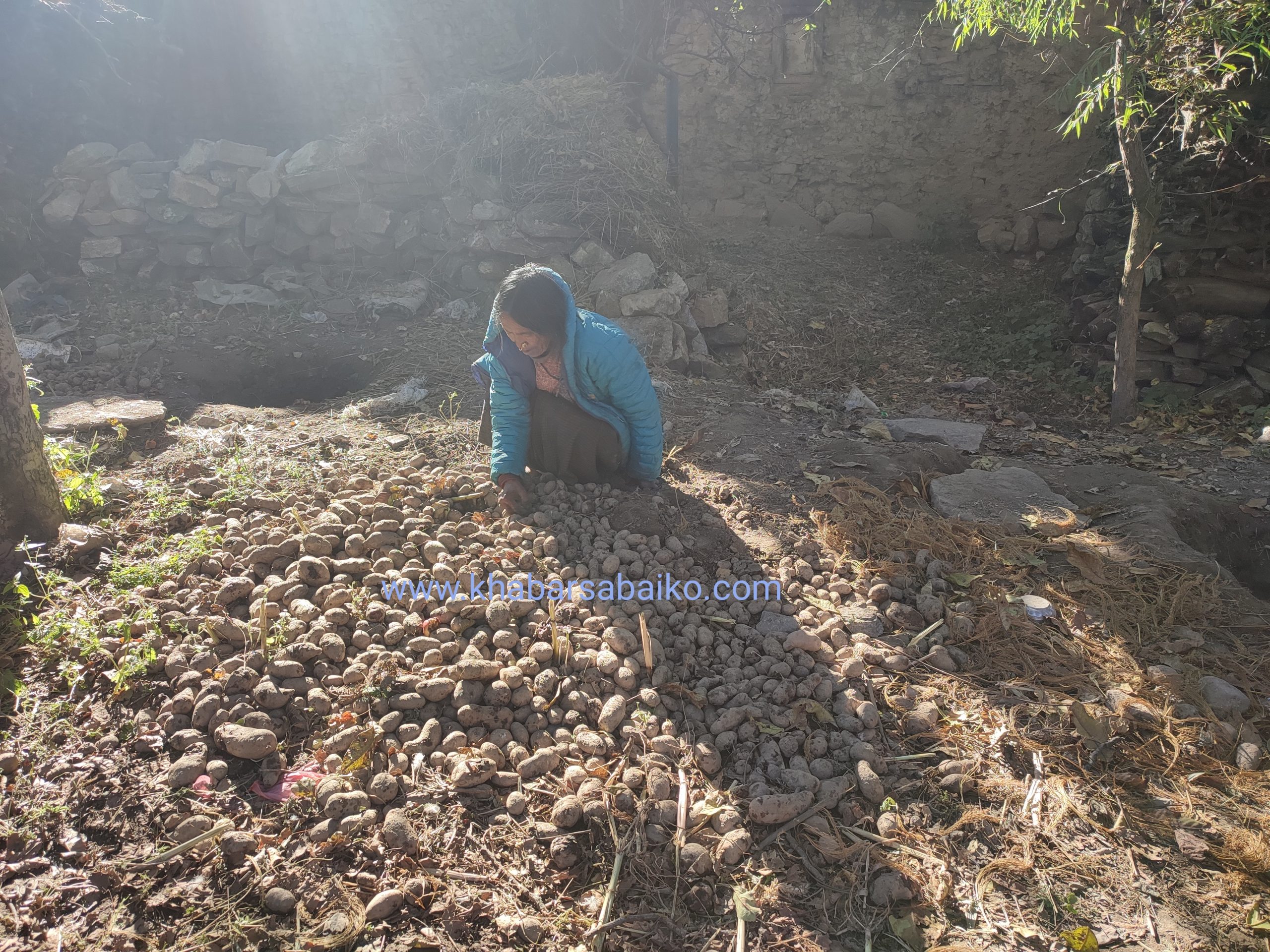 हुम्ला- सयौँ क्विन्टल आलु कुहिएर खेर गएपछि हुम्लाका किसान चिन्तित भएका छन्। बिउका लागि र हिउँदमा खानका लागि खाल्डोमा शीतभण्डार गरी राखेको आलु कुहिएपछि सिमकोट गाउँपालिका– ५ का किसान चिन्तित भएका हुन्।