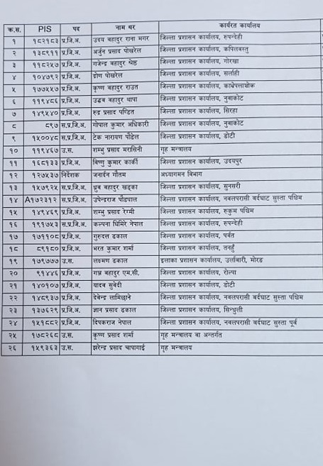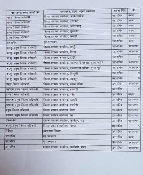 नुवाकोटका उद्धवबहादुर थापालाई गृहमन्त्रालयमा सरुवा गरिएको भने नुवाकोटमा द्रोण पोखरेललाई पठाइएको छ । त्यसैगरी सिरहामा कार्यरत रुद्रप्रसाद पण्डितलाई तनहुँ पठाइएको छ। सिन्धुलीमा जनार्दन गौतमको सरुवा भएको छ भने ध्रुवबहादुर खड्का उदयपुर पुगेका छन्। गृहले सहायक प्रमुख जिल्ला अधिकारीहरुको पनि सरुवा गरेको छ। गृहले पर्वतमा कल्पना घिमिरे नेपाल, कास्कीका गुरुदत्त ढकाल, रुपन्देहीमा शम्भुप्रसाद रेग्मी र गोरखामा देवेन्द्र लामिछानेलाई पठाएको छ।